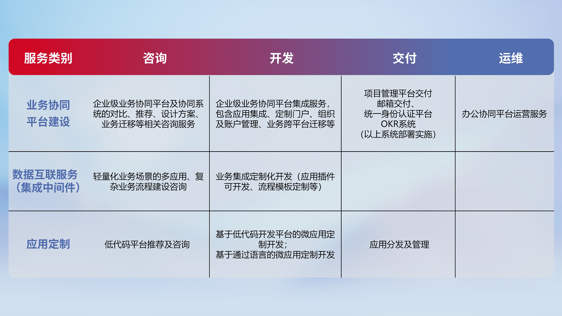 针对钉钉、、企微、、IDaas等平台级产品提供产品的规划、、、、方案、、、、交付、、定制化开发等服务,,实现如统一协同办公、、、、智能客户服务、、混合会议管理、、智能数据查询、、等业务场景,,,,实现数字化转型。。。。