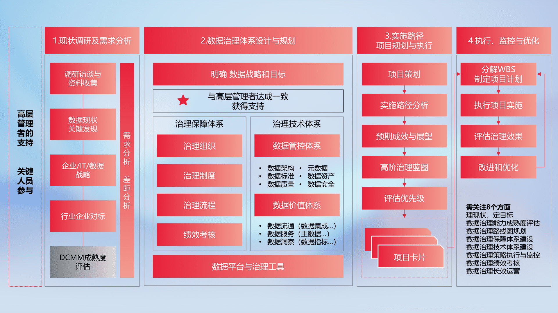 制定并执行统一的数据标准,,规范数据定义和格式,,,消除冗余和不一致性,,,实现跨部门和跨系统的数据一致性,,,,为企业提供标准化的数据基础。。